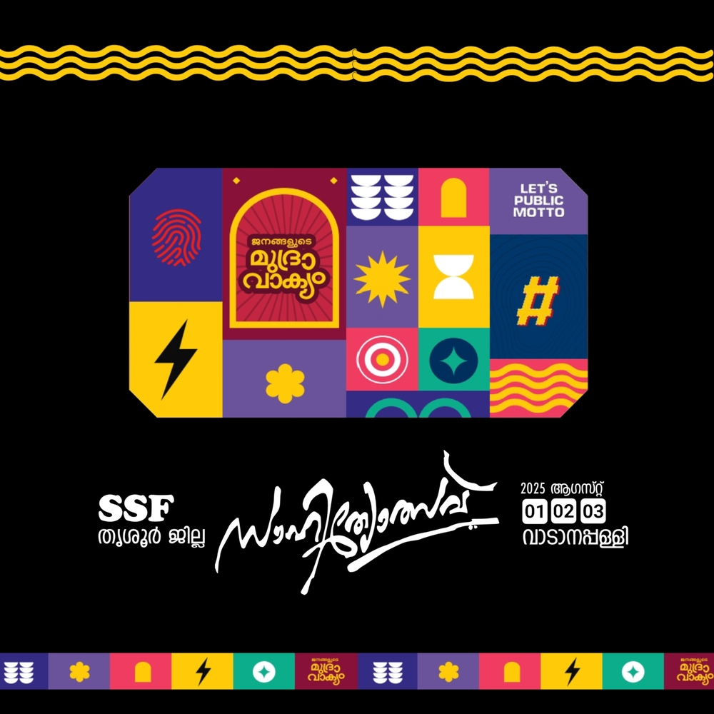 Throughout history, humanity has raised its voice — not just for itself, but for others, for nature, and for every form of life. These voices, shaped into powerful mottos, have sparked revolutions, consoled the wounded, awakened collective conscience, and transformed barren hearts into forests of hope. When expressed creatively, these slogans became more than words; they became strength, vision, and movement — planting seeds of awareness and hiding embers of revolution along the paths ahead. This year, “Let’s Public Moto,” SSF Thrissur District Sahithyotsav 2025 celebrates the timeless relevance of such voices. In a world where meaning often fades in noise, we return to the living power of public slogans — as poetry, protest, memory, and mission. Through stages like Shabda Mandiram, Inquilab Square, and the unifying space of Shabda Theruvu, the festival invites us to reclaim our voice, relive our history, and reimagine a future where the people’s motto still rises — loud, truthful, and alive.